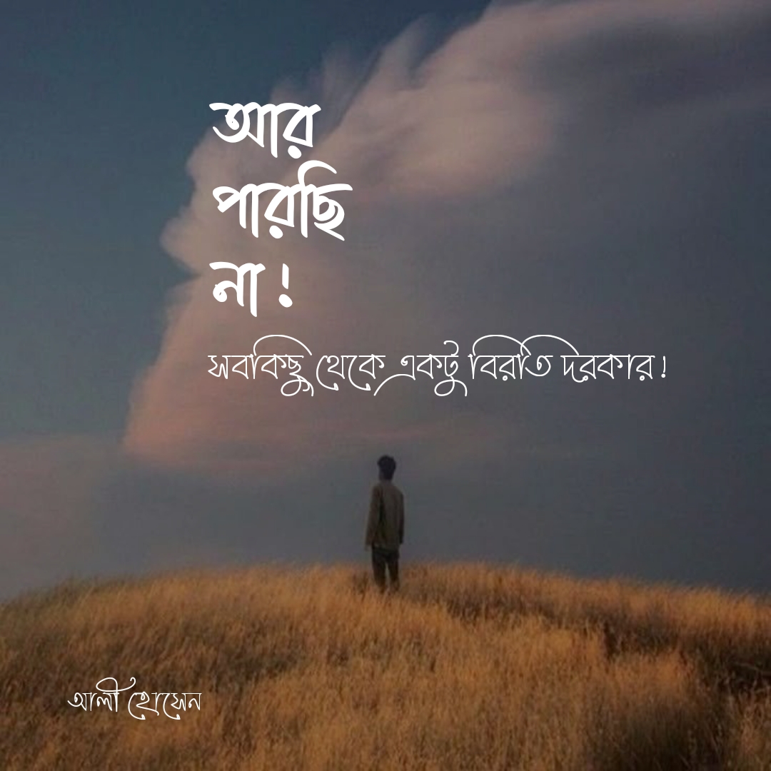 একটি আবেগঘন বাংলা উক্তি যেখানে বলা হয়েছে “আর পারছি না! সবচেয়ে থেকে একটু বিরতি দরকার!”। ছবিতে দেখা যায় এক ব্যক্তি ঘাসের মাঠে দাঁড়িয়ে বিশাল আকাশের দিকে তাকিয়ে আছে, যা মানসিক চাপ, একাকীত্ব ও বিরতির প্রয়োজনীয়তার প্রতীক। Motivational ও relatable বাংলা quote image।