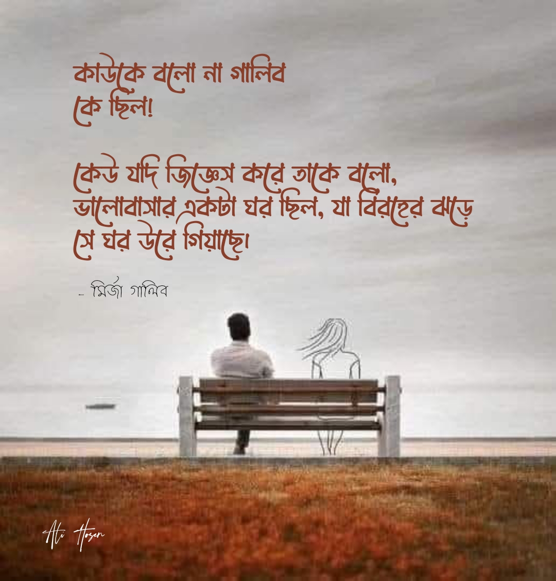 একটি আবেগঘন ও দার্শনিক বাংলা উক্তি যেখানে বলা হয়েছে— ভালোবাসা ছিল এক ঘর, যা বিরহের বড় ঘর উড়ে গিয়েছে। ছবিতে একটি বেঞ্চে একা বসে থাকা একজন মানুষ এবং পাশে কল্পিত নারীর অবয়ব দেখা যায়, যা স্মৃতি, হারানো ভালোবাসা ও একাকীত্বের প্রতীক। Deep romantic ও emotional বাংলা quote image।